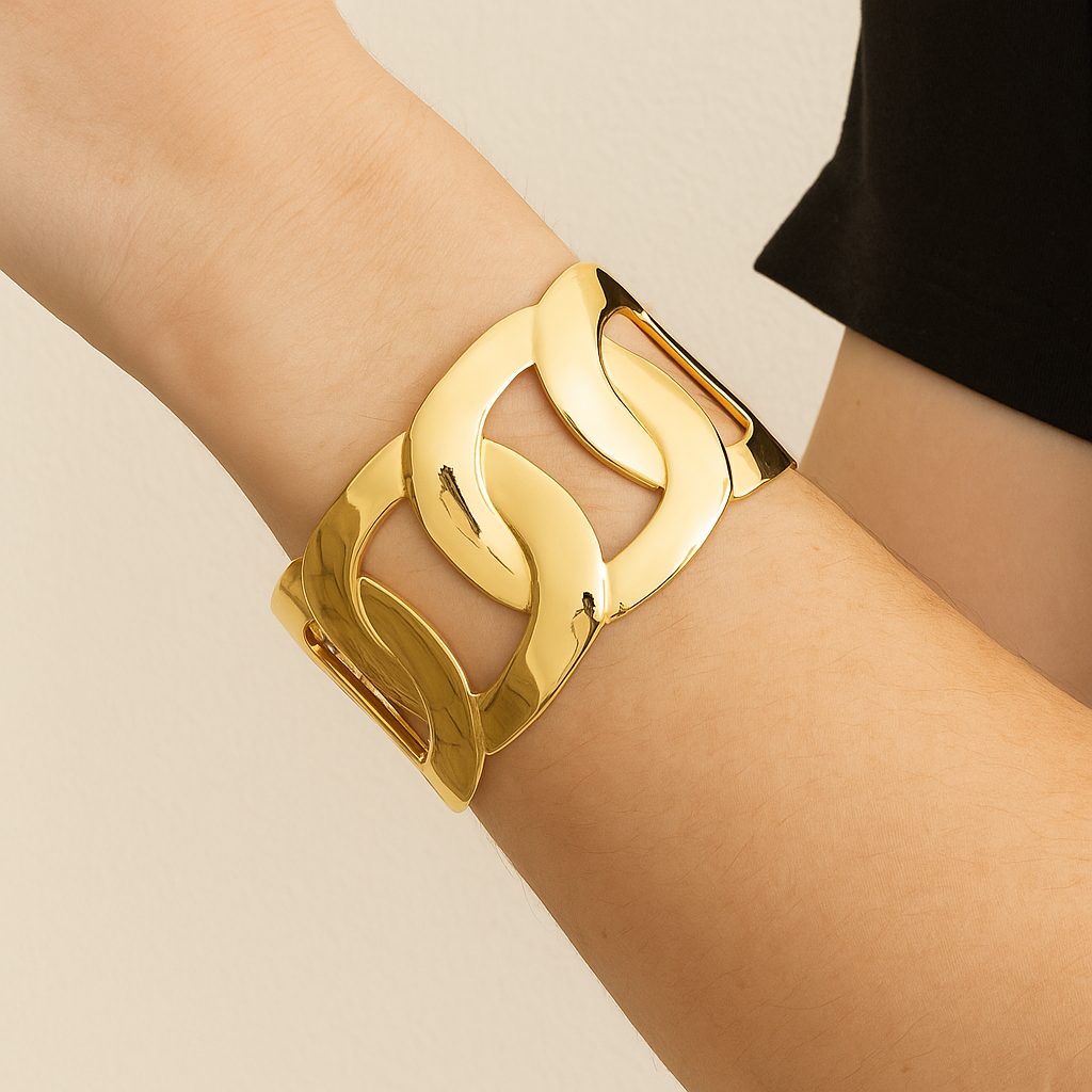 18K Gold Clad Polished Curb Link Motif Open Back Cuff Bracelet