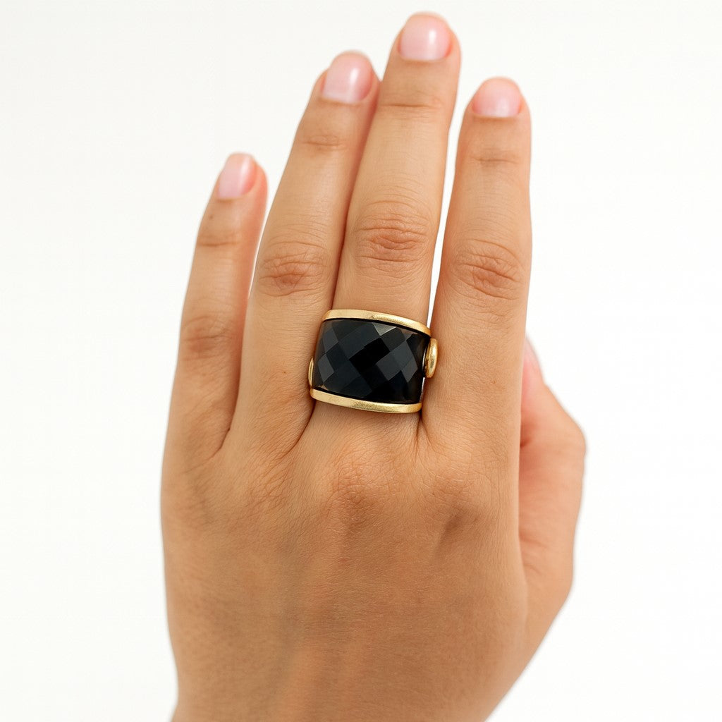 18K Gold Clad Bold East-West Onyx Crystal Satin Ring with Side Scroll Design